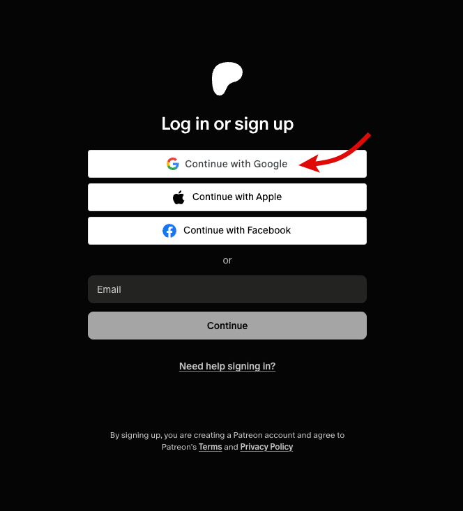 1. สมัครสมาชิกเวป Patron ที่ https://www.patreon.com/signup แนะนำให้เชื่อมต่อด้วย Google เลยจะสะดวกและไวที่สุด หรือถ้าเคยสมัครแล้วก็ Login ที่ https://www.patreon.com/login ได้เลย