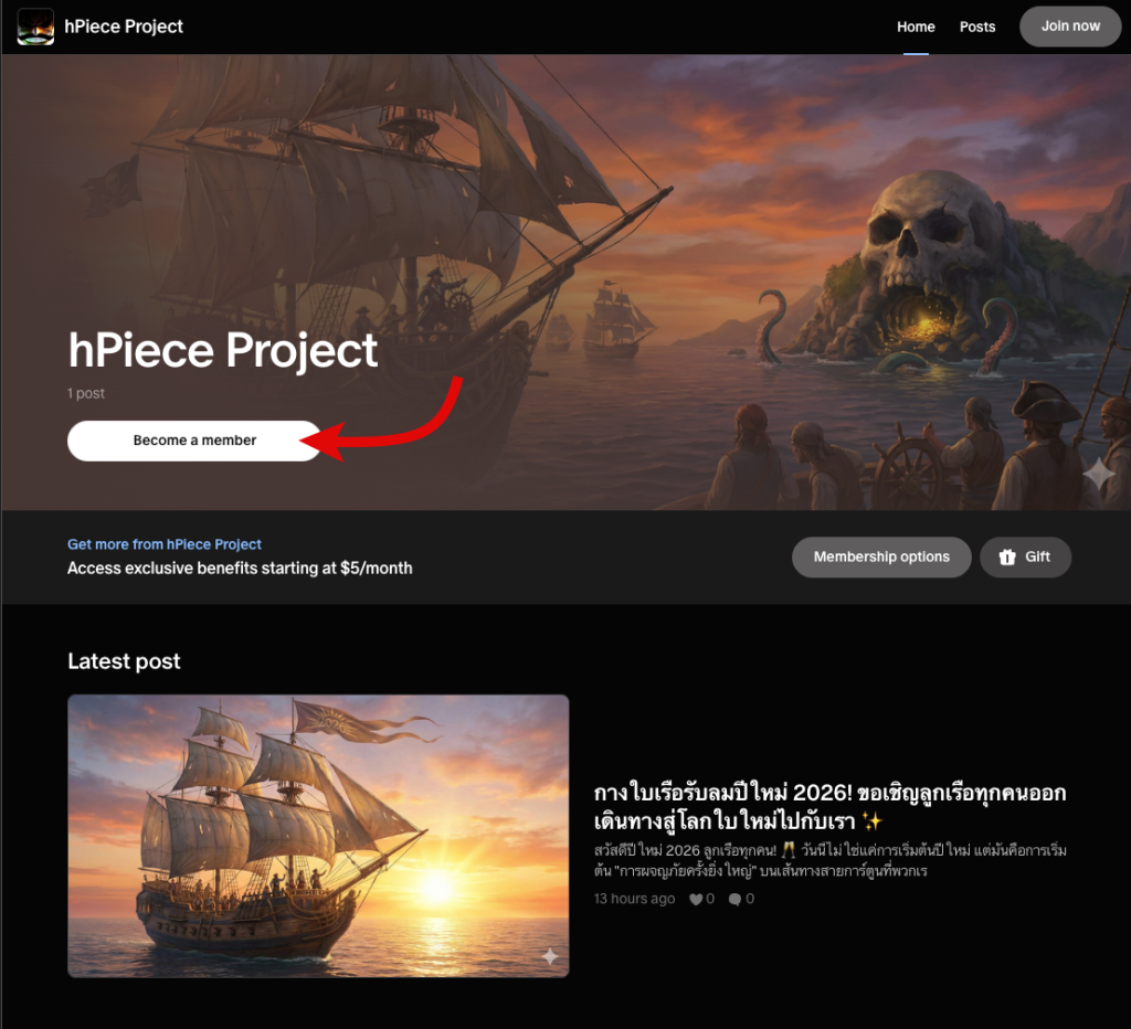 2. ไปที่หน้า Patreon ของ hPiece Project (https://www.patreon.com/cw/hPieceProject) กดปุ่ม Become a member